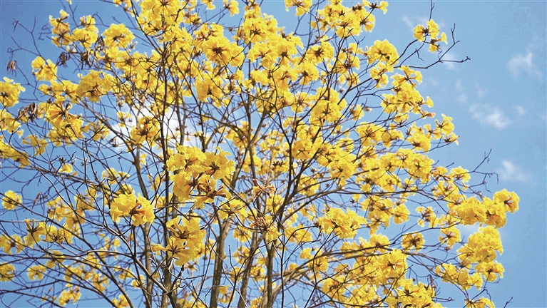 黄花风铃木因花黄色,形如风铃而得名。黄花风铃木的花朵从初露头角逐渐呈成片盛开之势,满树金灿灿的黄花,看起来美不胜收。纷繁的金色叶子被风鼓荡着吹起,好似翩翩起舞的蝴蝶。在微寒的南方初春时节,彰显出勃勃的生机和幸福的寓意。