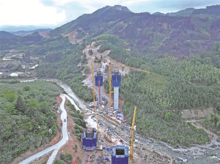 后塘特大桥是连通C2合同段A4终点与A5起点的一座特大桥,也是整个宁古高速中跨度最长、高度最高、建设难度最大的“三最工程”。该桥位于山区且线路复杂,道路坡陡弯急,极易受大雾天气影响,交通条件恶劣,进场便道规划难度大;桥址区域地貌起伏大、地质不良以及周边环境(水渠、人工弃土场)等因素影响,施工难度大。为保障工程高效率推进、高质量完成,在建设单位与监理单位的指导下,项目部不断优化技术方案、做好人员物资调配、抢抓旱季施工黄金期,后塘特大桥建设工作有序推进。