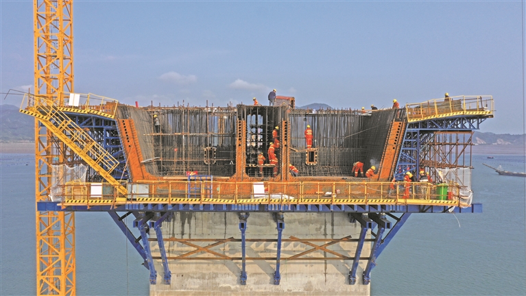 记者来到宁上高速控制性工程东吾洋特大桥施工现场,一大早,26名工人乘船登上东吾洋特大桥15#主墩。他们先要攀登44米高的梯笼,日复一日的锻炼,工人们一口气可以轻松登顶,在施工平台上进行钢筋绑扎作业。为赶进度,工人们每天都在离海面几十米高的平台上用餐,稍作休息后又继续赶工,直到结束一整天的工作才能下来。目前,该桥15#墩已进入上部结构施工,预计5月中旬将完成首个0#块浇筑任务。