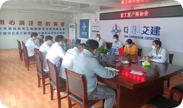 (巨龙三都澳陆岛交通码头项目部复工复产筹备会现场)