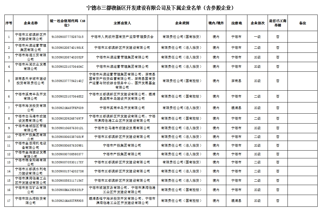 宁德市三都澳新区开发建设有限公司及下属企业名单(含参股企业)