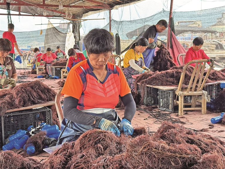 眼下正是养殖龙须菜的最佳时期,工人将收运上岸的龙须菜苗用绳子进行缠夹,两条为一组,再集中运往海上养殖区。沙江村养殖户朱春锦说:“只要水温、水质适宜,约20多天就能收获第一茬龙须菜。”