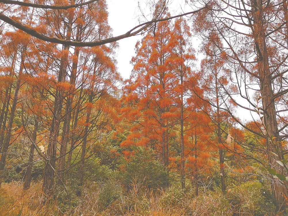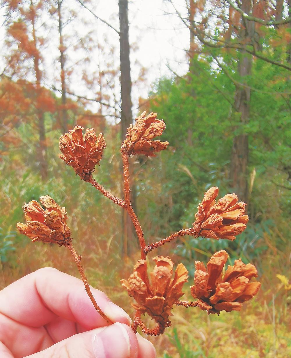 水松种子,天生自带“翅膀”。每年的1—2月份,鳞形叶的小枝顶端会开出球花,花谢后会结出绿色球果,成熟后呈褐色。倒卵圆形的球果,由一片片鳞片组成,覆瓦状排列。到10月,球果才会成熟,藏在球果里的种子是椭圆形的,还长有向下生长的披针形长翅,之后,在风力与水流的作用下,找到“落脚点”,生根发芽。