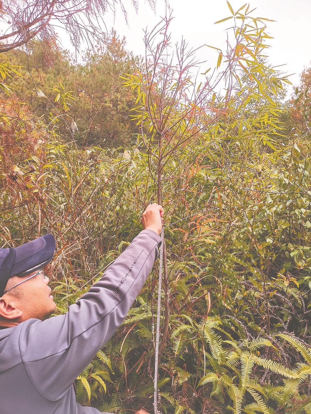 林业科技人员给野生水松测量、编号