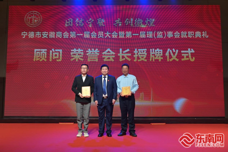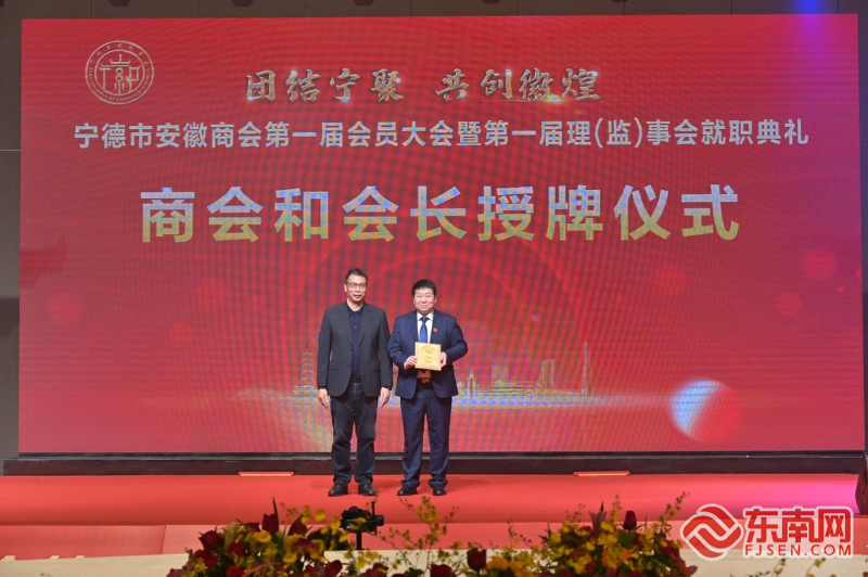 刘登健为宁德安徽商会当选会长李运增授牌。宁德安徽商会办公室供图