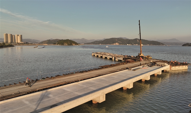 近日,在位于福鼎市点头镇龙田村的八尺门避风锚地工程建设现场,挖掘机、吊机、渣土车来回穿梭,各类工程机械设备运转不停。