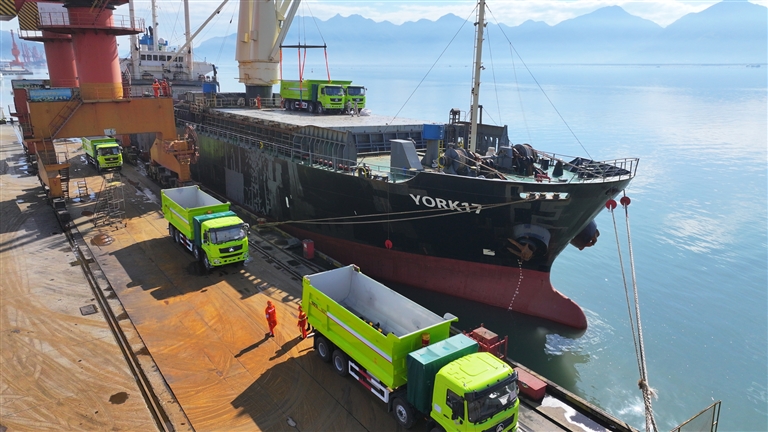 1月30日,宁德港口岸,搭载15辆新能源矿卡的伯利兹籍“约克17”轮完成出入境边防检查手续,离泊出境前往印度尼西亚青拓生产基地。