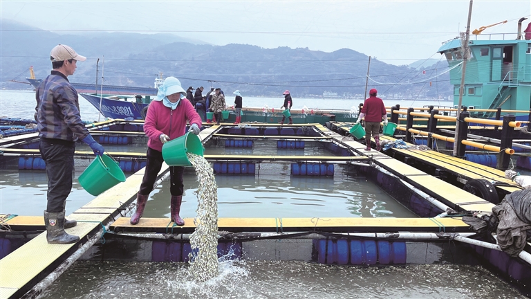 连日来,福鼎养殖户正忙着将大黄鱼苗从育苗室投放到渔排上。今年福鼎培育大黄鱼苗在12亿尾至13亿尾之间,预计在3月底投放结束。
